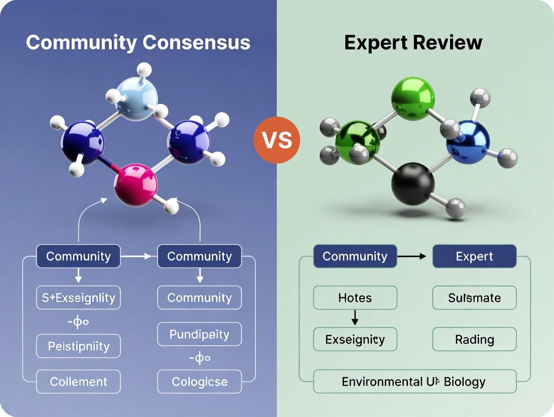 This analysis demonstrates that community consensus and expert review are not mutually exclusive but are complementary forces in the biomedical research ecosystem. Expert review provides depth, methodological rigor, and authoritative validation, while community consensus offers breadth, rapid scalability, and diverse perspectives that can enhance reproducibility and identify blind spots. The future lies in strategically designed hybrid models that leverage the strengths of both—using structured expert oversight to frame questions and validate core findings, while integrating open community feedback to foster transparency, accelerate error correction, and ensure research remains aligned with broader societal and scientific needs. Embracing this integrated approach will be crucial for navigating the increasing complexity of drug development and improving the robustness and impact of clinical research.