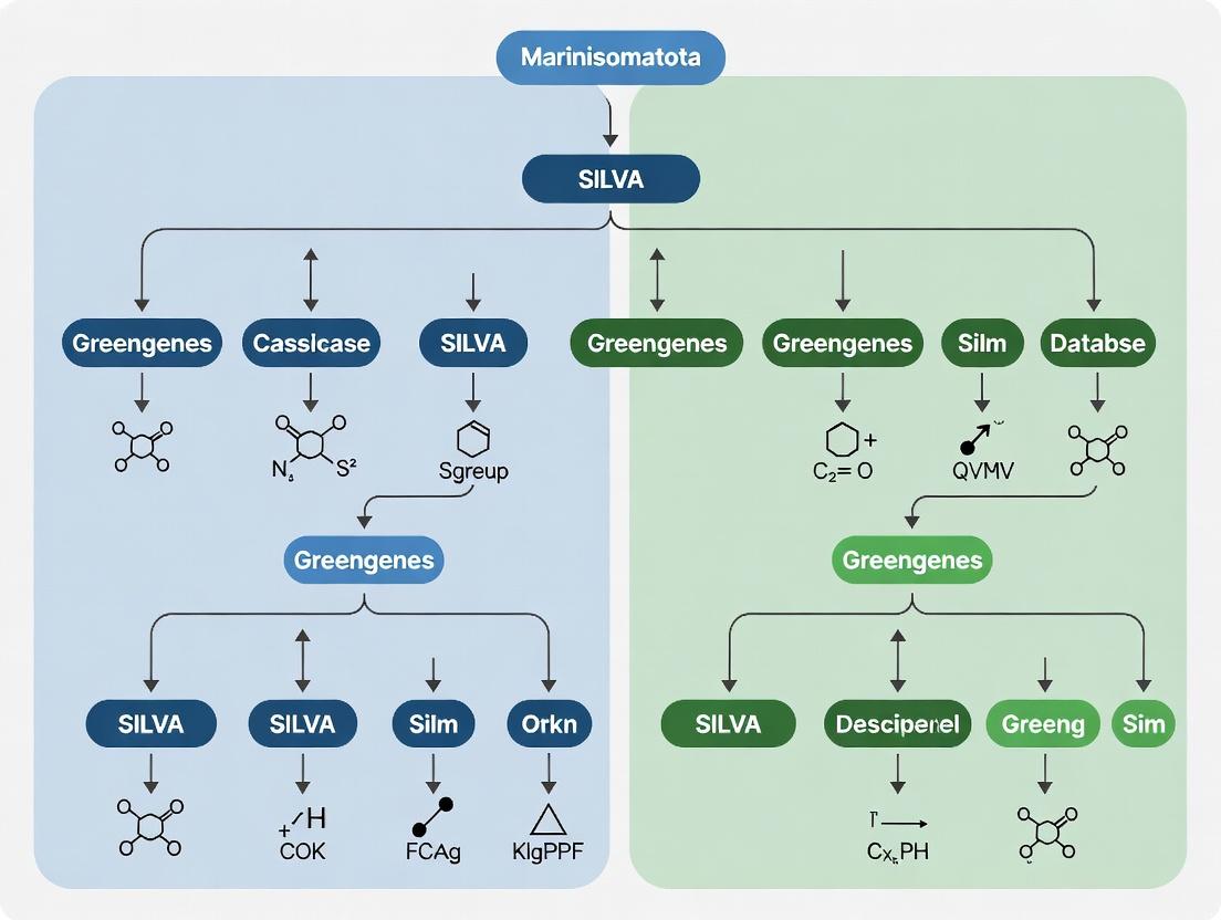 This comparison guide is framed within a broader thesis investigating the classification of Marinisomatota (formerly SAR406) in SILVA versus Greengenes, critical for environmental and drug discovery research. The choice of reference database directly impacts taxonomic profiling accuracy, affecting downstream analyses in microbial ecology and biomarker discovery.