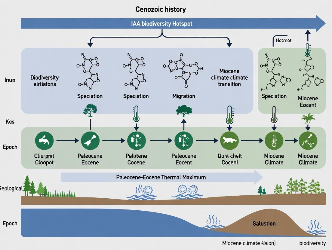 The Cenozoic history of the IAA reveals a complex, non-linear narrative of biodiversity assembly driven by the protracted collision of tectonic plates, dynamic oceanography, and oscillating climates. This deep-time perspective is not merely academic; it provides the essential evolutionary framework for understanding the genesis of extreme phylogenetic diversity and the concomitant biochemical novelty that makes the IAA a prime target for biomedical prospecting. For researchers, resolving the methodological challenges of integrating genomic, fossil, and earth-system models remains paramount. For drug discovery, this history underscores that endemic species from biogeographic suture zones are likely reservoirs of unique biosynthetic pathways. Future directions must focus on finer-scale, temporally resolved paleo-reconstructions and multi-omics integration to directly link historical biogeographic events with the evolution of specific bioactive compounds, ultimately transforming our understanding of this hotspot from a static map of richness into a dynamic forecast of evolutionary innovation and resilience.